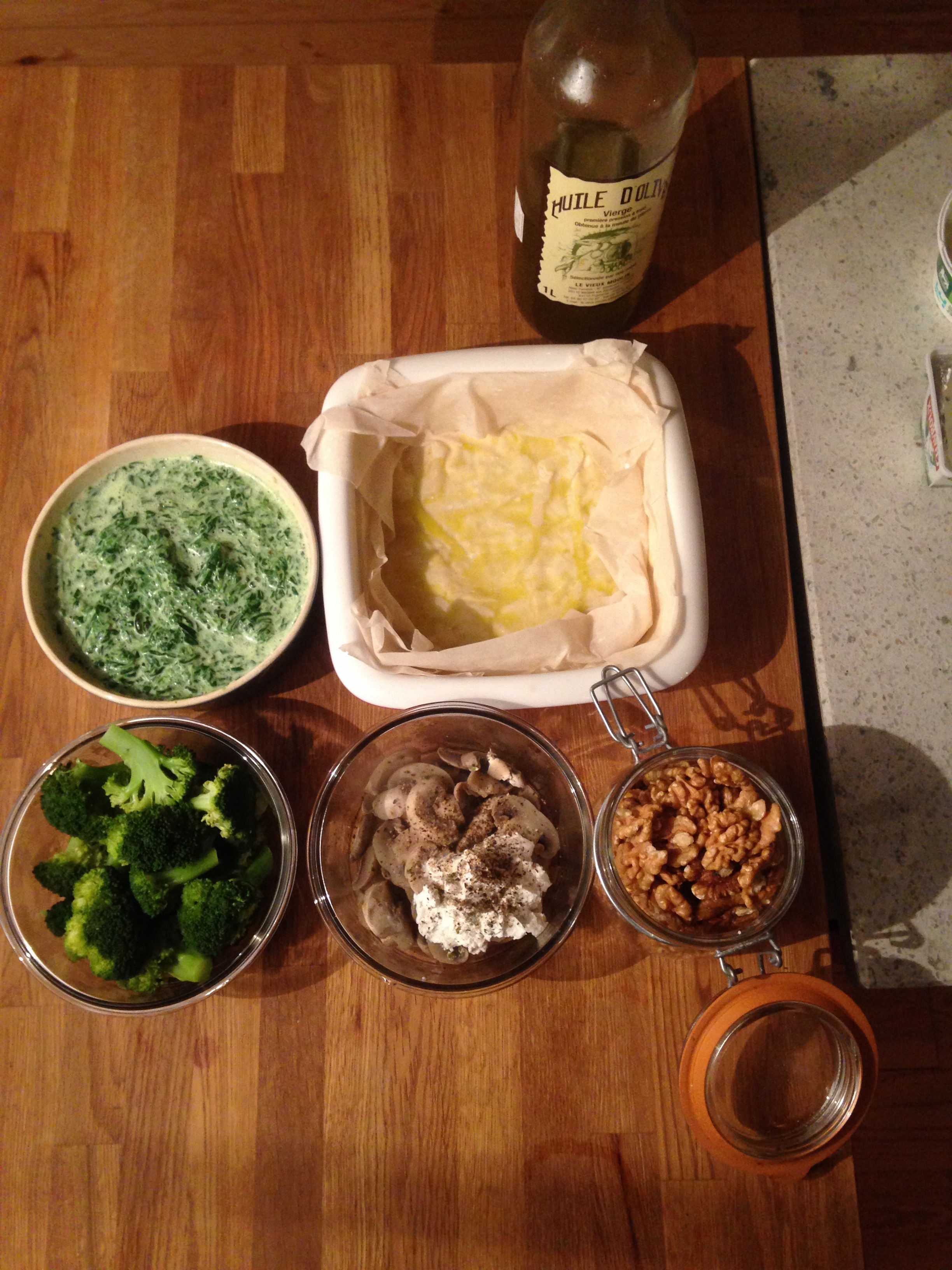 – laagje spinazie toevoegen; terug twee filodeeglaagjes; de broccoli toevoegen (en optioneel walnoten); eindigen met terug 2 filodeeglaagjes; beetje olijfolie over smeren en de op 200 graden voorverwarmde oven in gedurende 20 minuten;