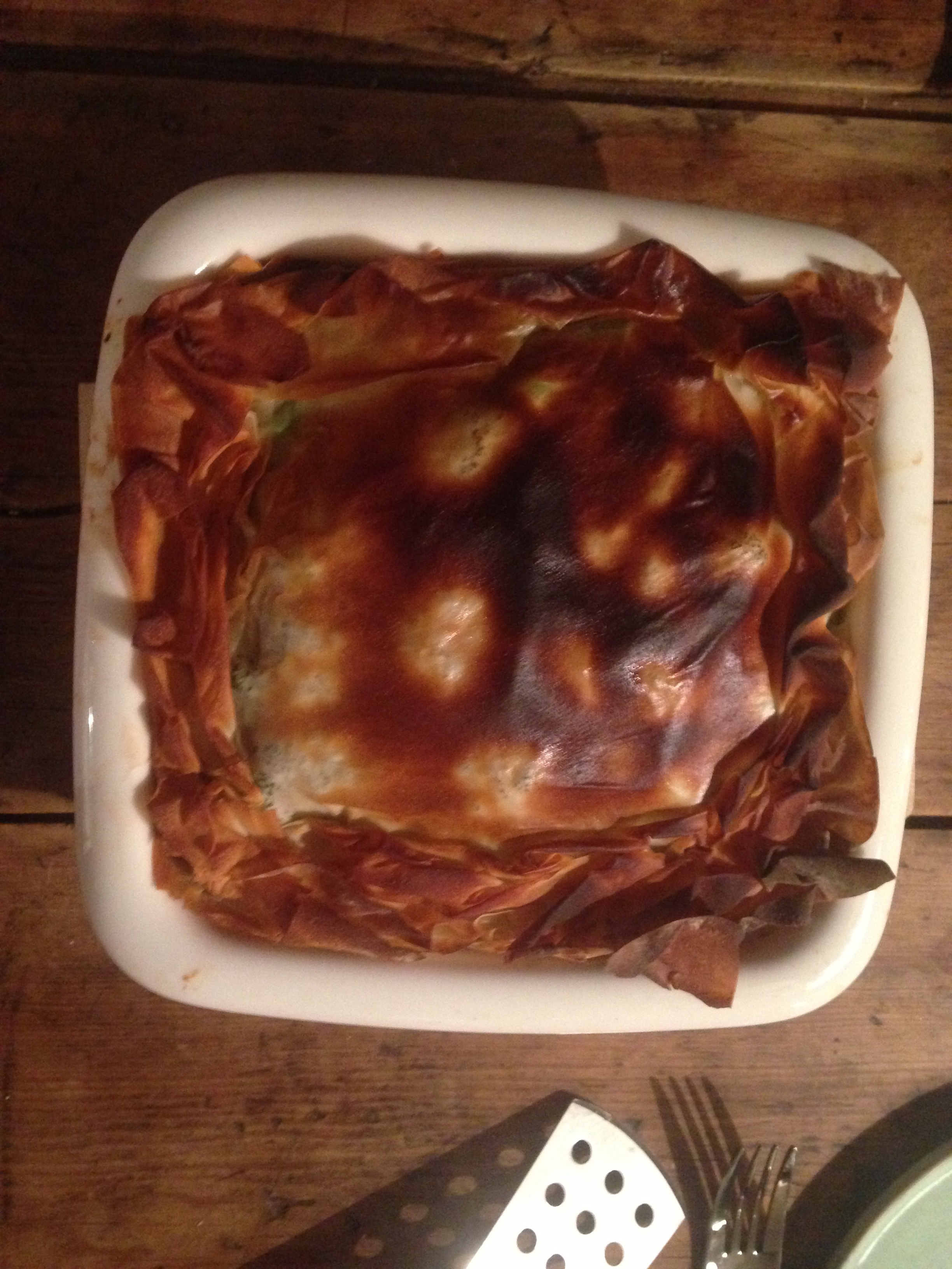 – terug twee laagjes filodeeg toevoegen (met dus tussen de beide laagjes een beetje olijfolie; en de randjes die over de ovenschotel zouden komen, gewoon wat toevouwen);