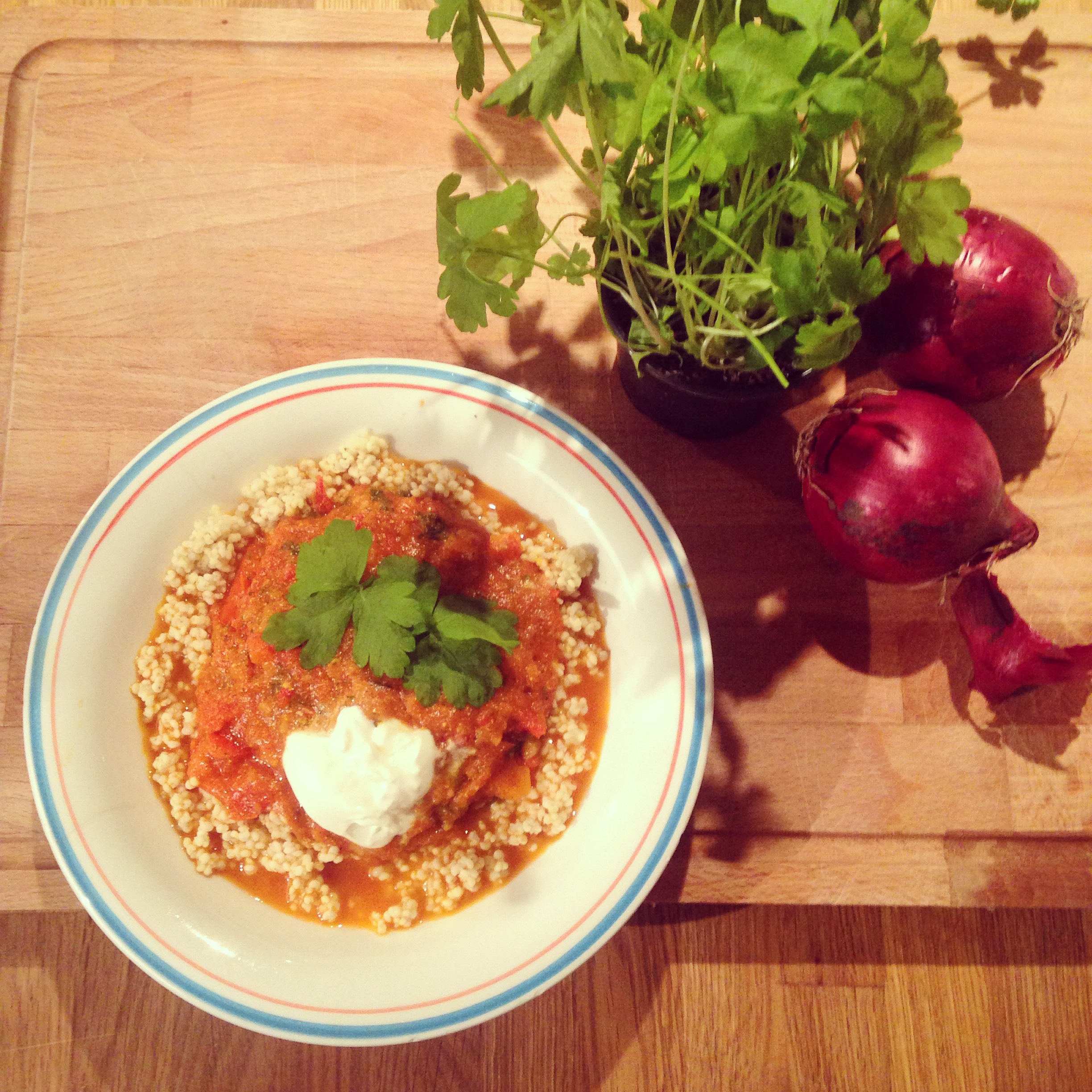 Vanavond dit gerechtje van gierst met een pikante tomatengroentesaus en een toefje zure room.