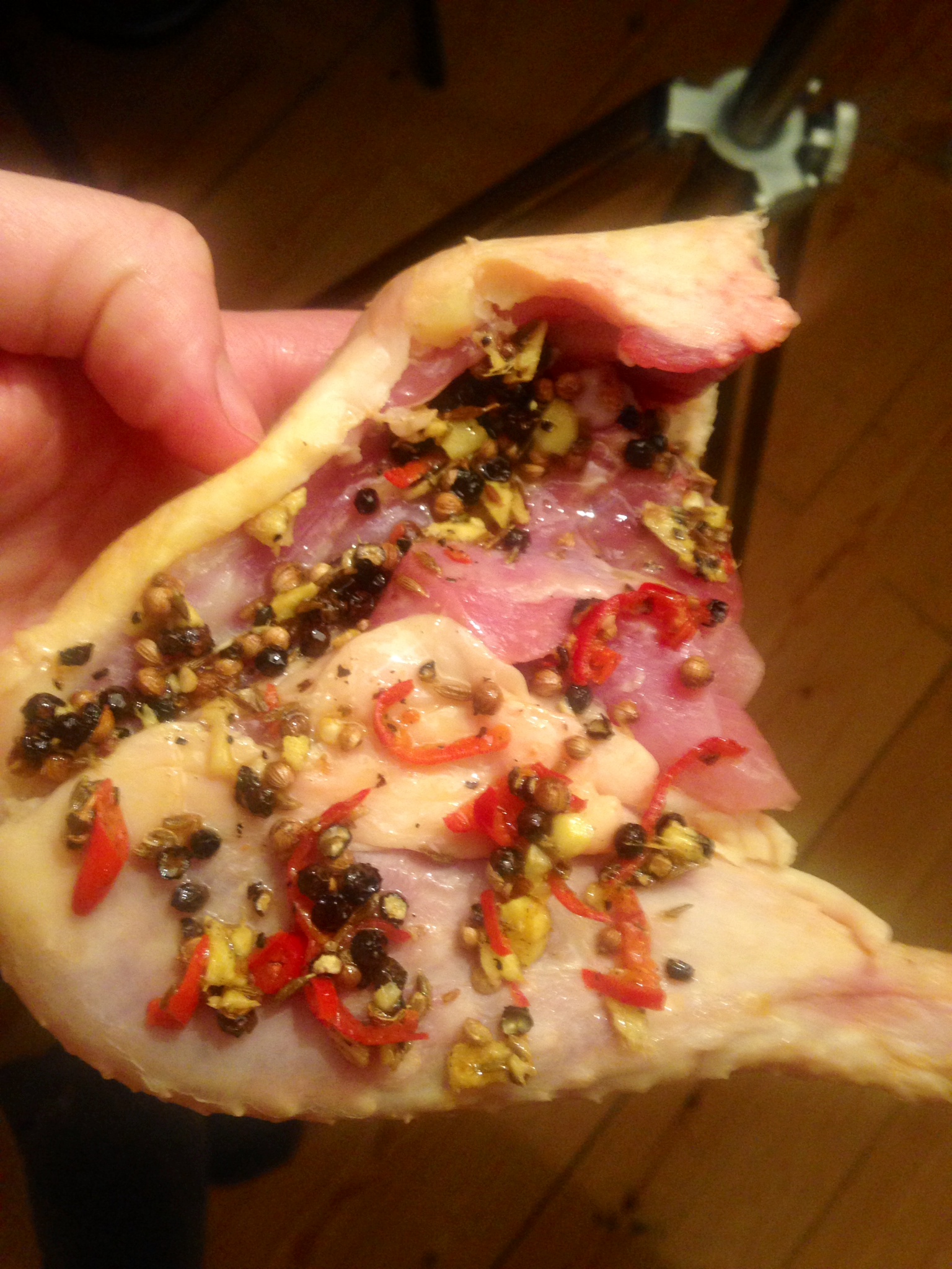 – intussen de bouten insmeren met het kruidenmengsel (zie foto 2);