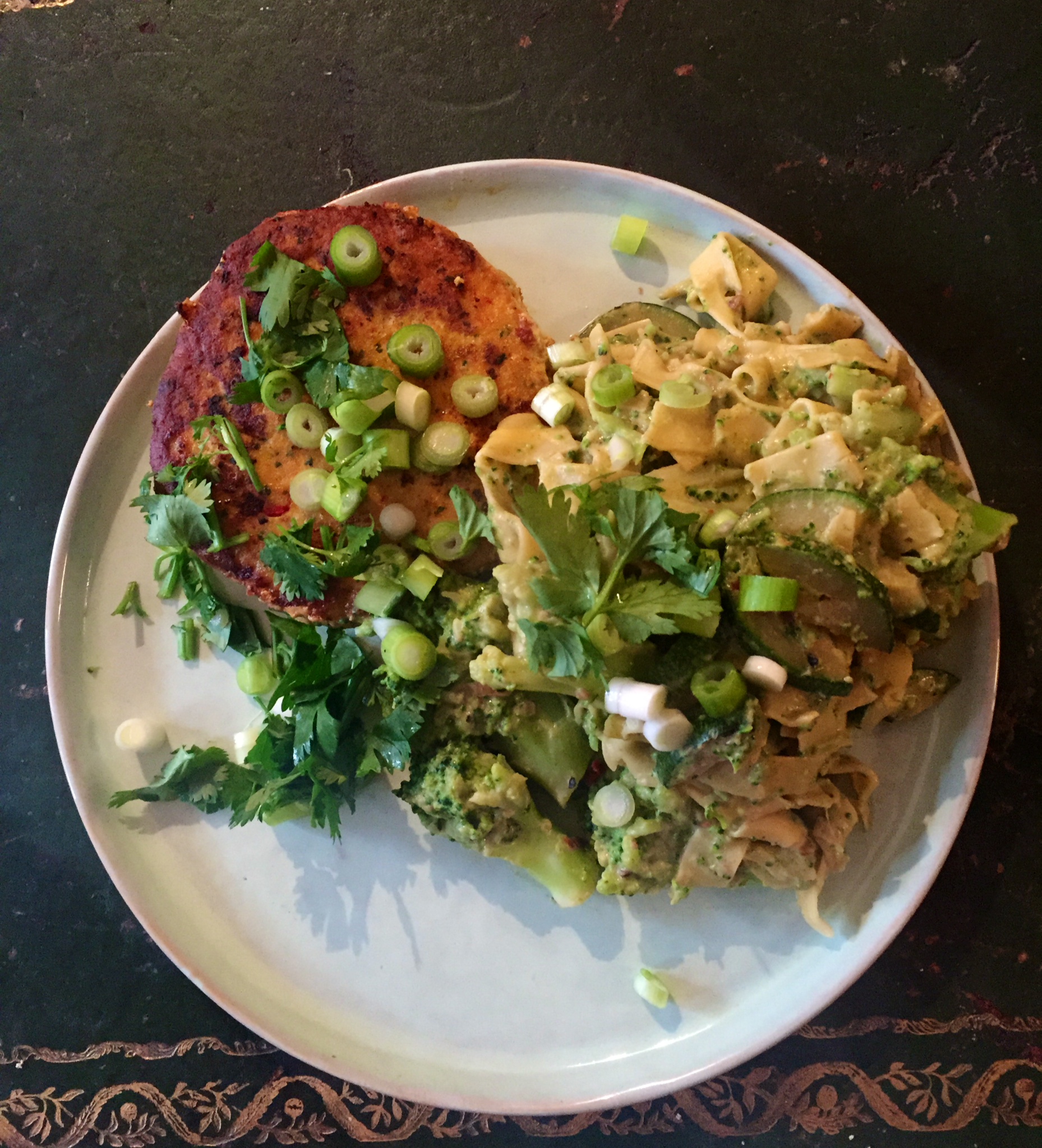 – dien de visburgers op samen met de groentenpasta en strooi hierover de lente-uitjes en de rest van de koriander (en optioneel wat parmezaan).