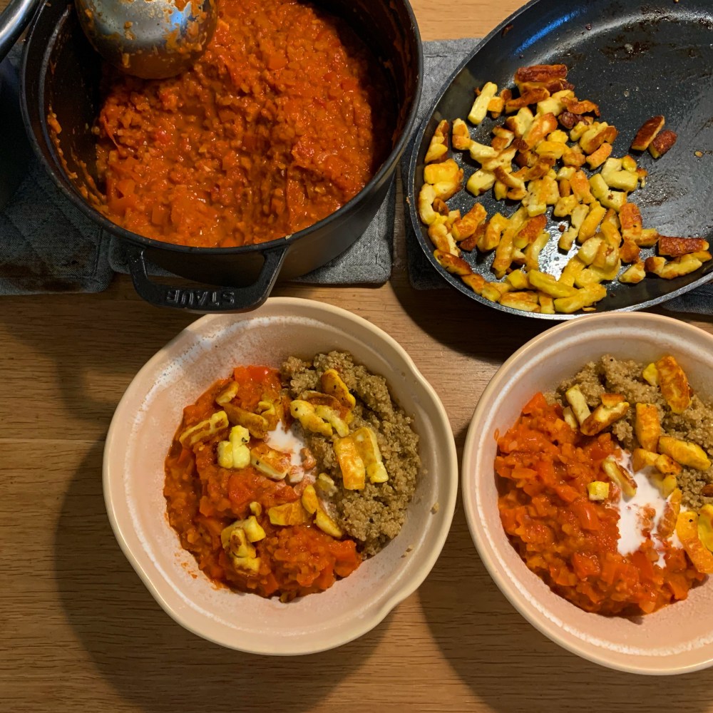 ⁃ serveer de quinoa met de paprikacurrysaus en de gebakken reepjes halloumi.