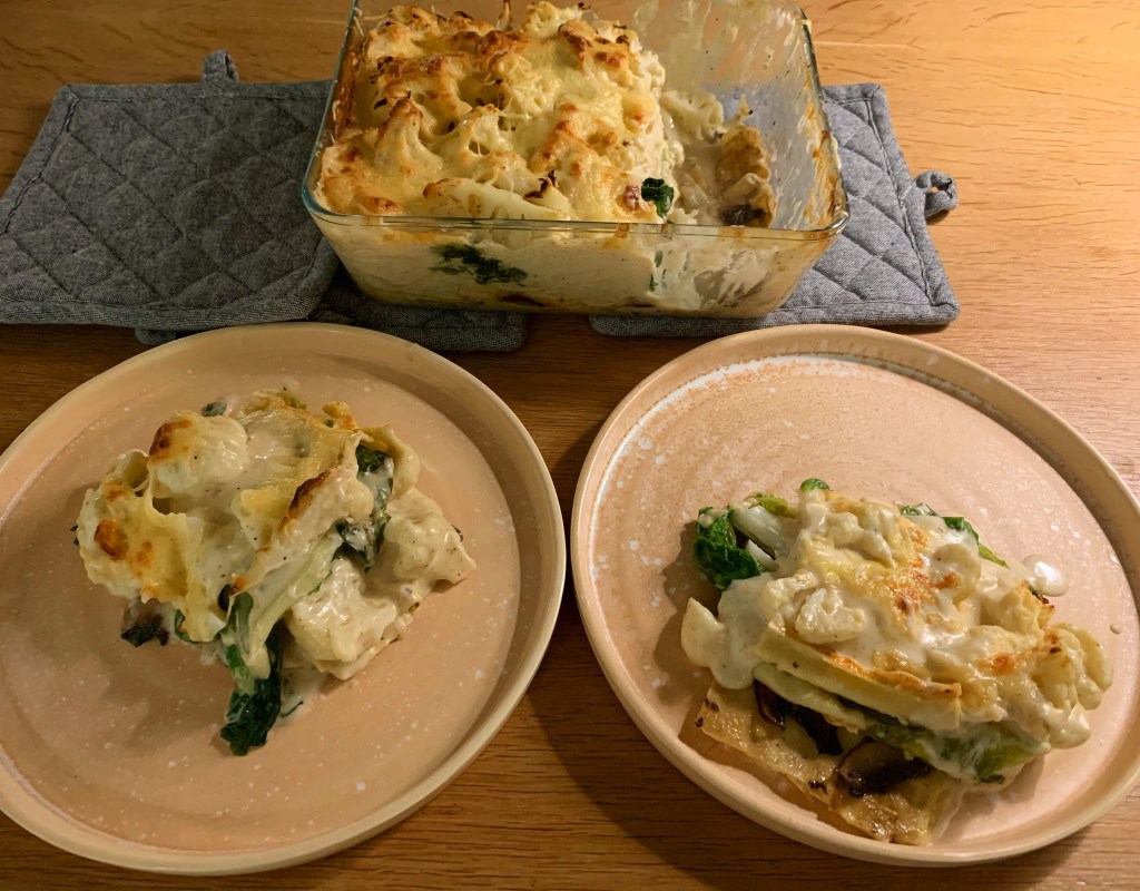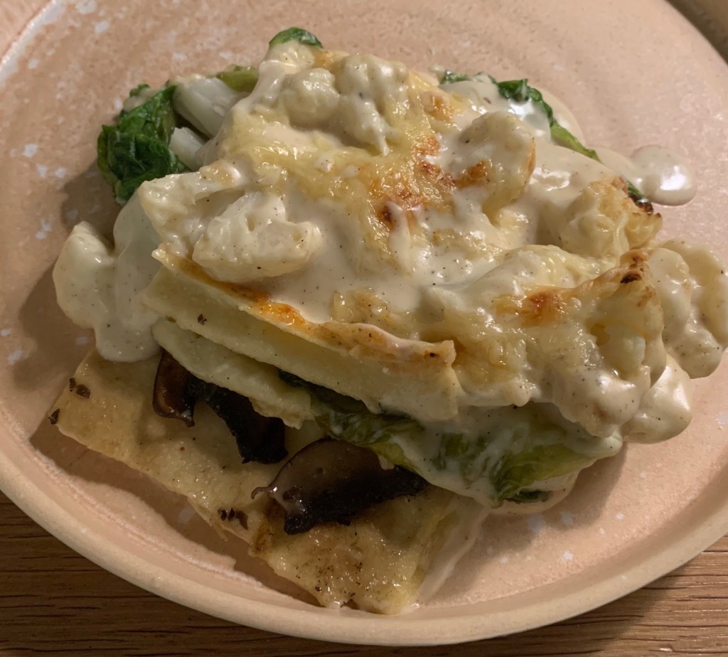 ⁃ Laagjes bouwen: begin met klein laagje bechamelsaus zodat de lasagne niet aan de ovenschotel kleeft; lasagnevel; helft van de bloemkool; lasagnevel; bechamelsaus; lasagnevel; portobello’s; lasagnevel; bechamelsaus; lasagnevel; andijvie; lasagnevel; rest bloemkool en rest bechamelsaus; bestrooien met extra emmentaler. In de oven gedurende 25tal minuten (laatste drietal minuten op grillstand)